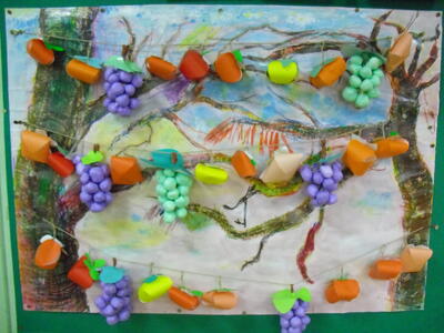 秋の掲示物(しらさぎ学級) 投稿: 管理者 (17:38) しらさぎ学級の1年生で秋の掲示物を作りました。折り紙で作った「柿」とお花紙で作った「ぶどう」です。 立体的でふっくらとした実がとてもかわいいです。色鮮やかな秋の景色となりました。 2・3年生は文化発表会に向けての準備をすすめています。 Tweet -